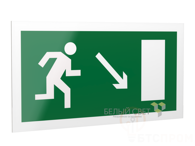 Знак безопасности "Направление к эвакуационному выходу направо вниз", габаритные размеры 418х218 мм, фактические размеры 400х200 мм, сигнальный цвет - зеленый, контрастный цвет - белый
