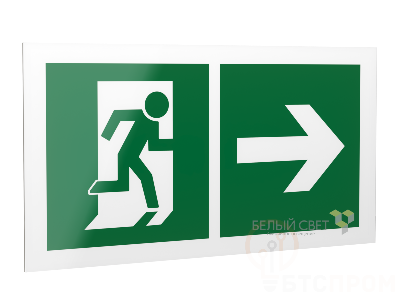 Знак безопасности "Направление к эвакуационному выходу направо", габаритные размеры 418х218 мм, фактические размеры 400х200 мм, сигнальный цвет - зеленый, контрастный цвет - белый