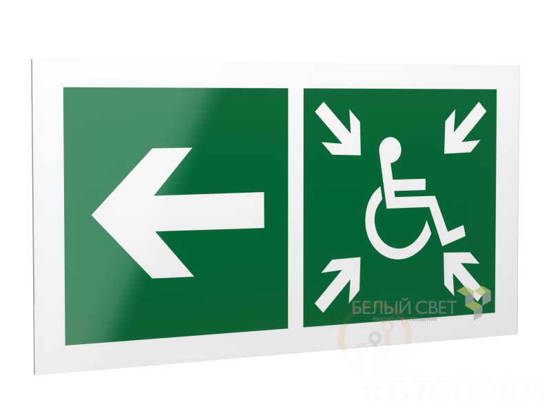 Знак безопасности "Направление движения к пункту сбора (безопасной зоне) МГН налево", габаритные размеры 418х218 мм, фактические размеры 400х200 мм, сигнальный цвет - зеленый, контрастный цвет - белый