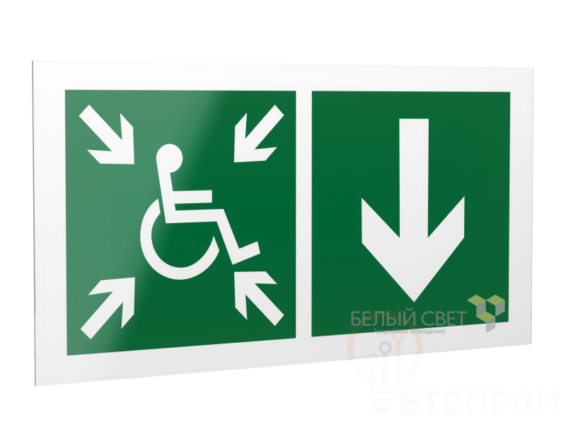 Знак безопасности "Указатель двери пункта сбора (безопасной зоны) МГН (правосторонний)", габаритные размеры 418х218 мм, фактические размеры 400х200 мм, сигнальный цвет - зеленый, контрастный цвет - белый