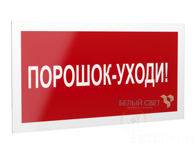 Знак безопасности "Порошок – уходи!", габаритные размеры 418х218 мм, фактические размеры 400х200 мм, сигнальный цвет - красный, контрастный цвет - белый