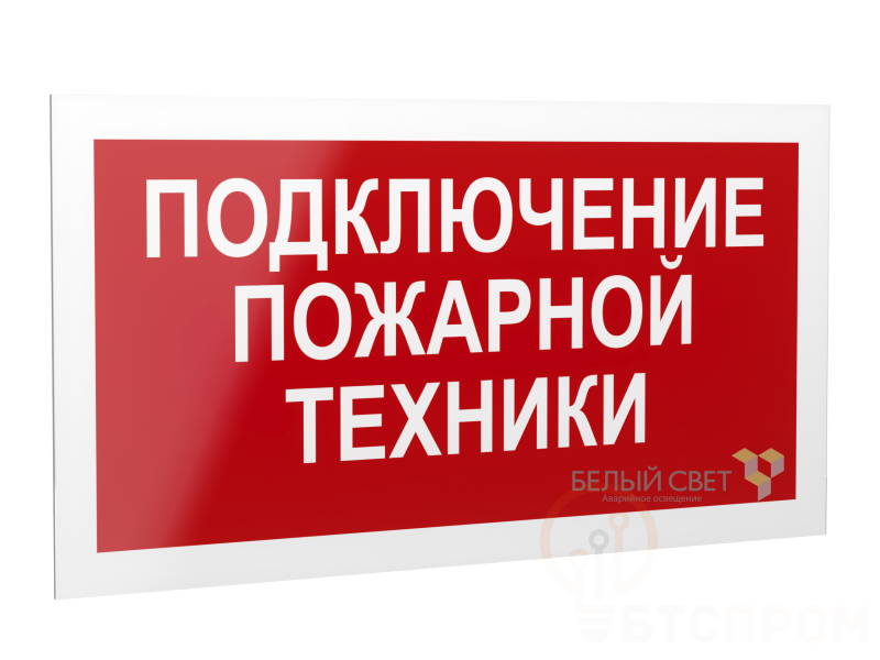 Знак безопасности "Подключение пожарной техники", габаритные размеры 418х218 мм, фактические размеры 400х200 мм, сигнальный цвет - красный, контрастный цвет - белый