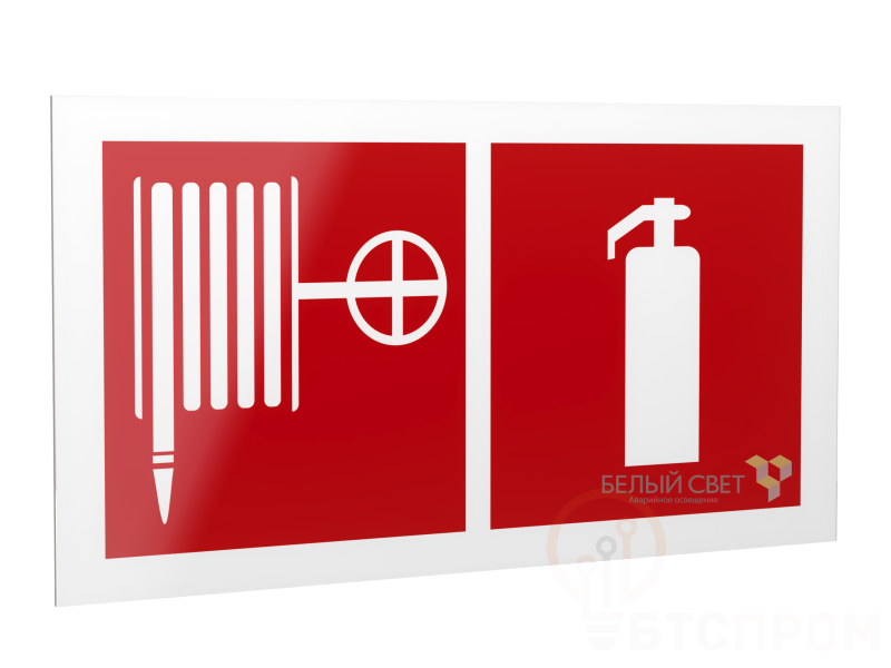 Знак безопасности "Пожарный кран и огнетушитель", габаритные размеры 418х218 мм, фактические размеры 400х200 мм, сигнальный цвет - красный, контрастный цвет - белый