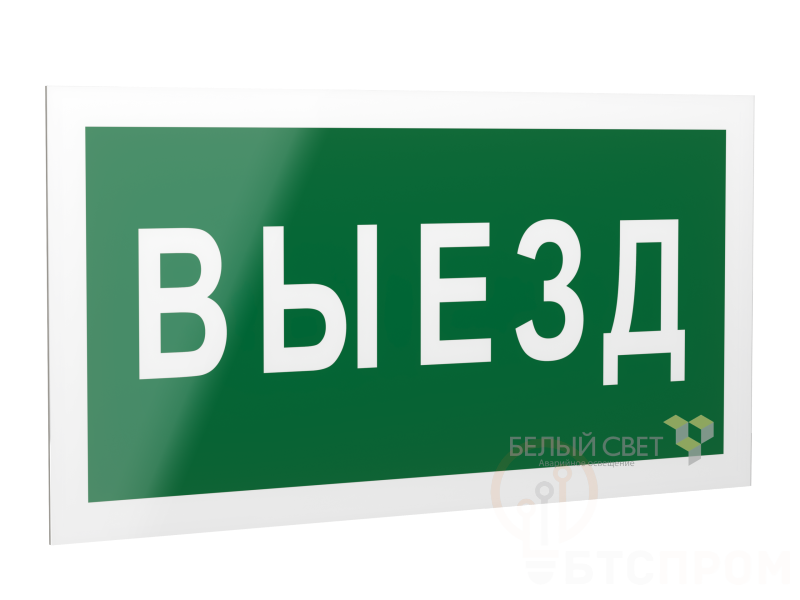 Знак безопасности "Указатель выезда", габаритные размеры 418х218 мм, фактические размеры 400х200 мм, сигнальный цвет - зеленый, контрастный цвет - белый