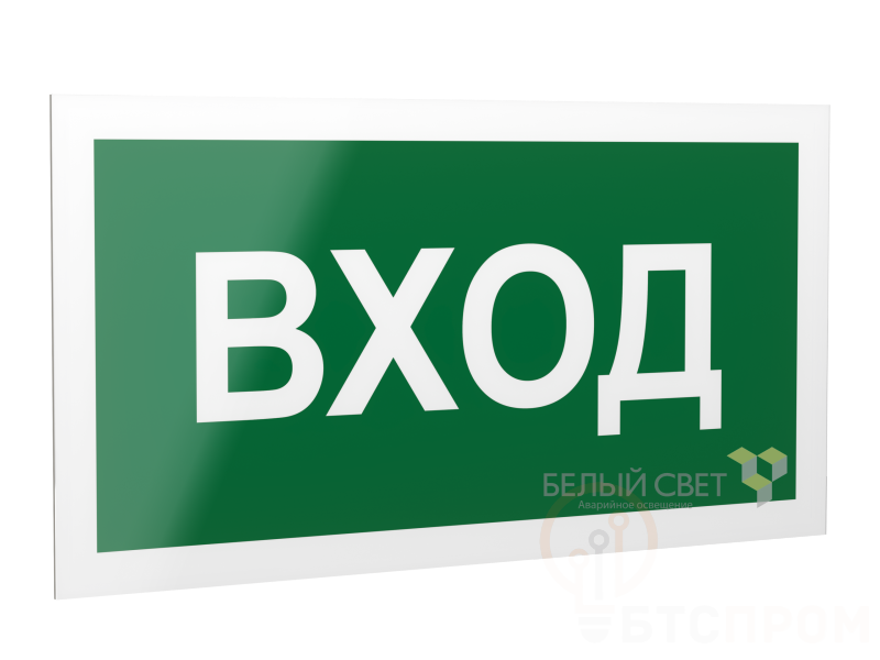 Знак безопасности "Указатель входа", габаритные размеры 418х218 мм, фактические размеры 400х200 мм, сигнальный цвет - зеленый, контрастный цвет - белый