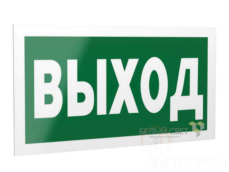 Знак безопасности "Выход", габаритные размеры 418х218 мм, фактические размеры 400х200 мм, сигнальный цвет - зеленый, контрастный цвет - белый
