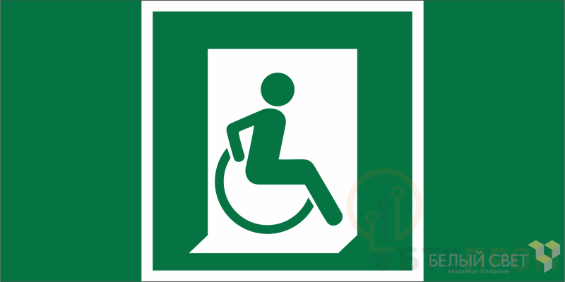 Знак безопасности "Выход для МГН здесь (правосторонний)" габаритные размеры 200х100 мм, фактические размеры 100х100 мм, сигнальный цвет - зеленый, контрастный цвет - белый