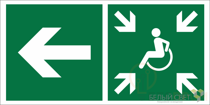 Знак безопасности "Направление движения к пункту сбора (безопасной зоне) МГН налево" габаритные размеры 200х100 мм, фактические размеры 200х100 мм, сигнальный цвет - зеленый, контрастный цвет - белый