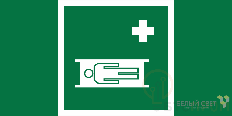 Знак безопасности "Средства выноса (эвакуации) пораженных" габаритные размеры 200х100 мм, фактические размеры 100х100 мм, сигнальный цвет - зеленый, контрастный цвет - белый