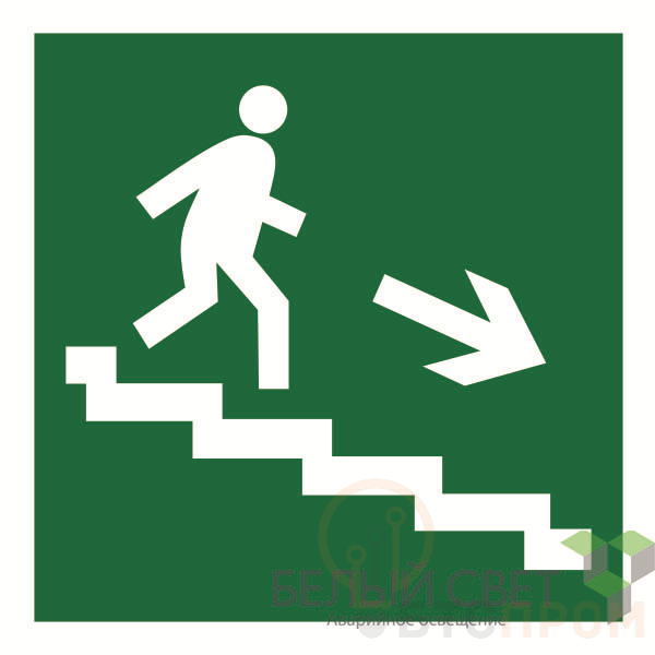 Знак безопасности "Направление к эвакуационному выходу по лестнице вниз", габаритные размеры 200х200 мм, фактические размеры 200х200 мм, сигнальный цвет - зеленый, контрастный цвет - белый