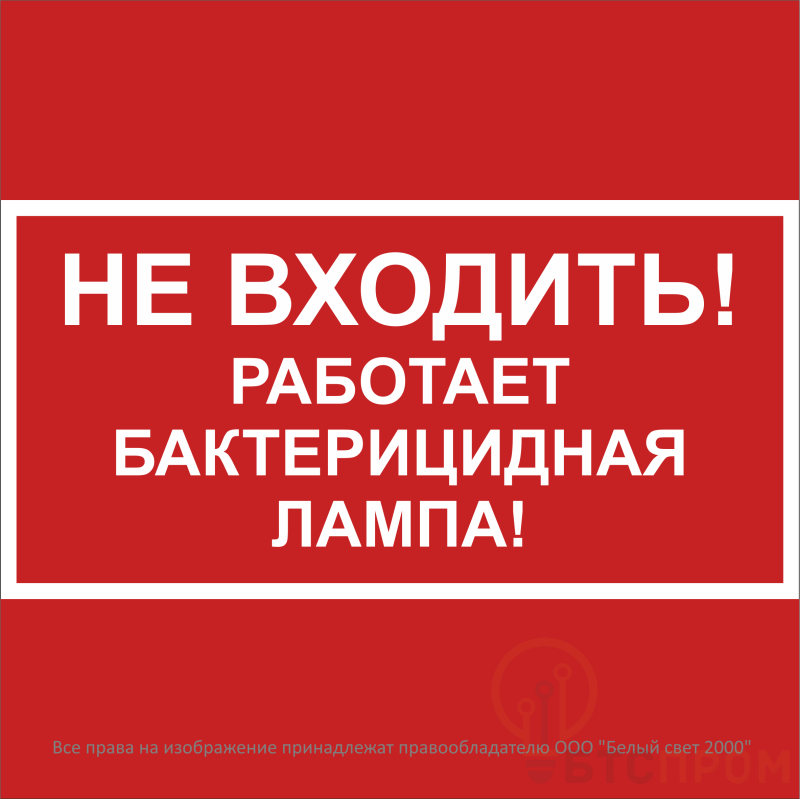 Знак безопасности BL-2020B.EC22 «Не входить! Работает бактерицидная лампа!» — это специализированная табличка, предназначенная для предупреждения персонала и посетителей о работе ультрафиолетовых облучателей. Яркая и четкая надпись на белом фоне эффективно привлекает внимание и предотвращает случайное попадание в зону дезинфекции, где ведется обеззараживание воздуха и поверхностей.