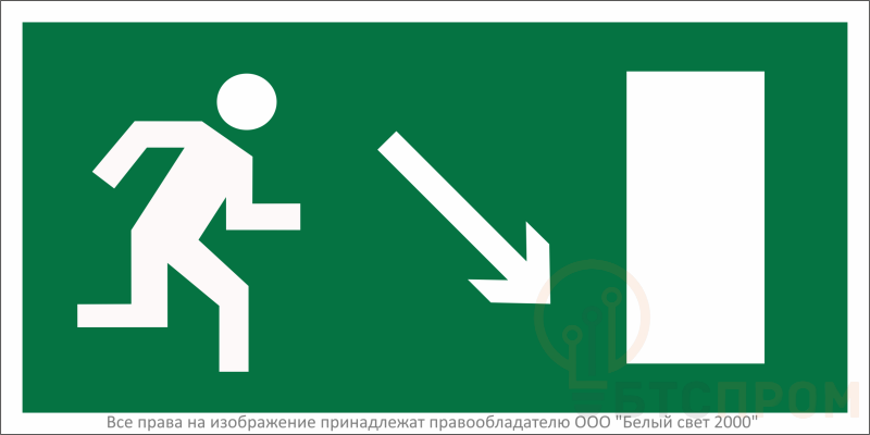 Знак безопасности "Направление к эвакуационному выходу направо вниз" габаритные размеры 300х150 мм, фактические размеры 300х150 мм, сигнальный цвет - зеленый, контрастный цвет - белый