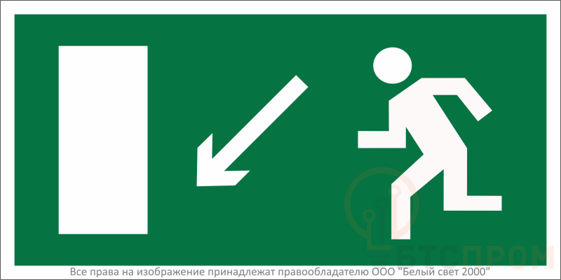 Знак безопасности "Направление к эвакуационному выходу налево вниз" габаритные размеры 300х150 мм, фактические размеры 300х150 мм, сигнальный цвет - зеленый, контрастный цвет - белый