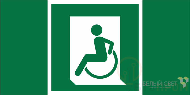 Знак безопасности "Выход для МГН здесь (левосторонний)" габаритные размеры 300х150 мм, фактические размеры 150х150 мм, сигнальный цвет - зеленый, контрастный цвет - белый