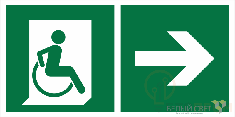 Знак безопасности "Направление движения к эвакуационному выходу МГН направо" габаритные размеры 300х150 мм, фактические размеры 300х150 мм, сигнальный цвет - зеленый, контрастный цвет - белый