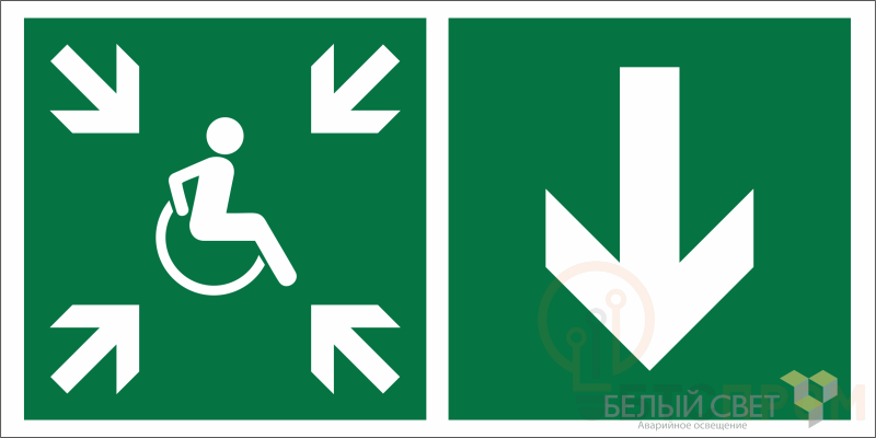 Знак безопасности "Указатель двери пункта сбора (безопасной зоны) МГН (правосторонний)" габаритные размеры 300х150 мм, фактические размеры 300х150 мм, сигнальный цвет - зеленый, контрастный цвет - белый