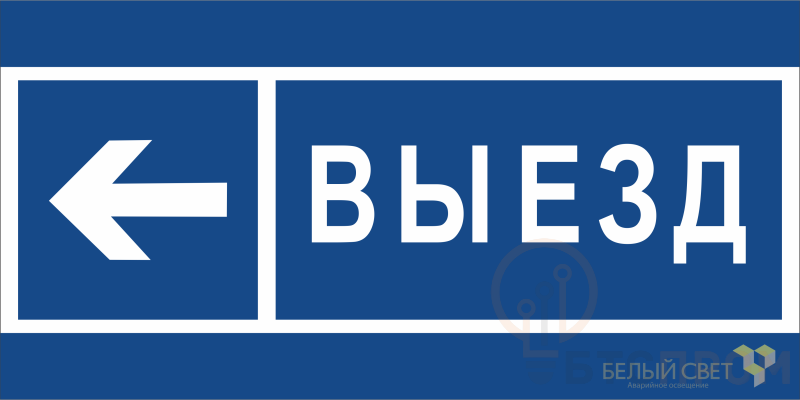 Знак безопасности "Направление к воротам выезда налево" габаритные размеры 300х150 мм, фактические размеры 300х110 мм, сигнальный цвет - синий, контрастный цвет - белый