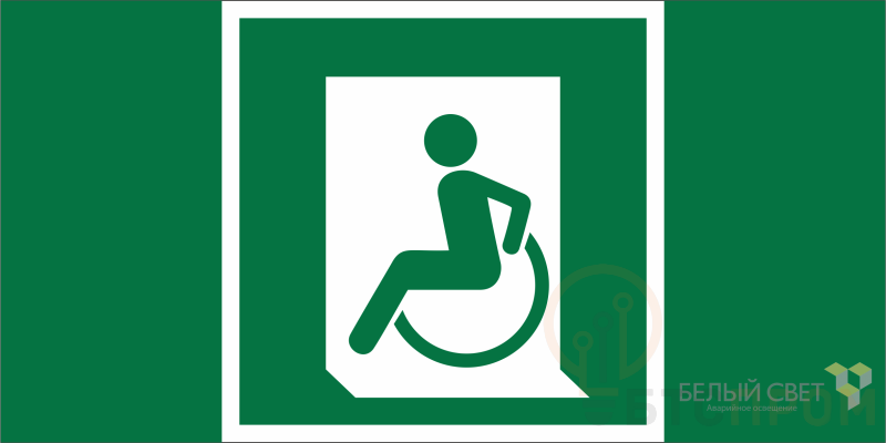 Знак безопасности "Выход для МГН здесь (левосторонний)", габаритные размеры 300х150 мм, фактические размеры 300х150 мм, сигнальный цвет - зеленый, контрастный цвет - белый