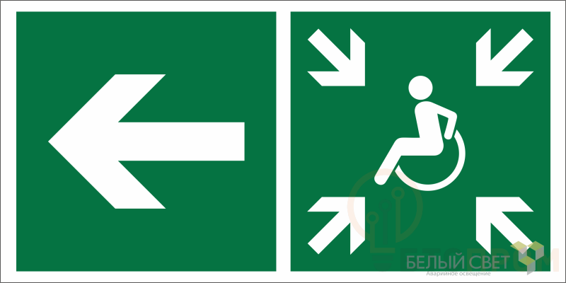 Знак безопасности "Направление движения к пункту сбора (безопасной зоне) МГН налево", габаритные размеры 300х150 мм, фактические размеры 300х150 мм, сигнальный цвет - зеленый, контрастный цвет - белый