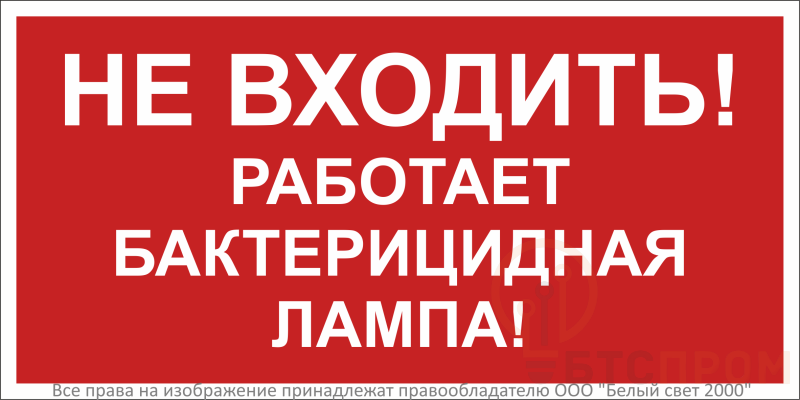 Предупреждающий знак безопасности BL-3015B.EC22 предназначен для информирования персонала и посетителей о работе бактерицидных ламп. Четкая и понятная надпись «Не входить! Работает бактерицидная лампа!» эффективно предотвращает случайное попадание людей в зону обеззараживания, где используется ультрафиолетовое излучение, опасное для кожи и глаз.