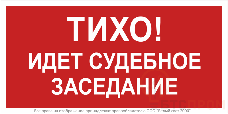 Знак безопасности "Тихо! Идет судебное заседание!"", габаритные размеры 300х150 мм, фактические размеры 300х150 мм, сигнальный цвет - красный, контрастный цвет - белый