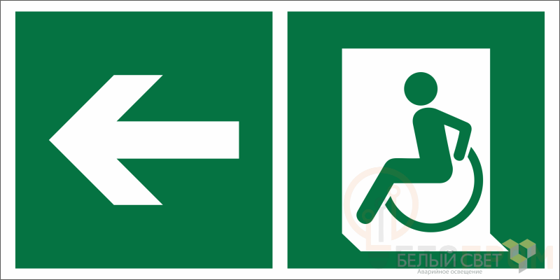Знак безопасности "Направление движения к эвакуационному выходу МГН налево" габаритные размеры 350х175 мм, фактические размеры 350х175 мм, сигнальный цвет - зеленый, контрастный цвет - белый