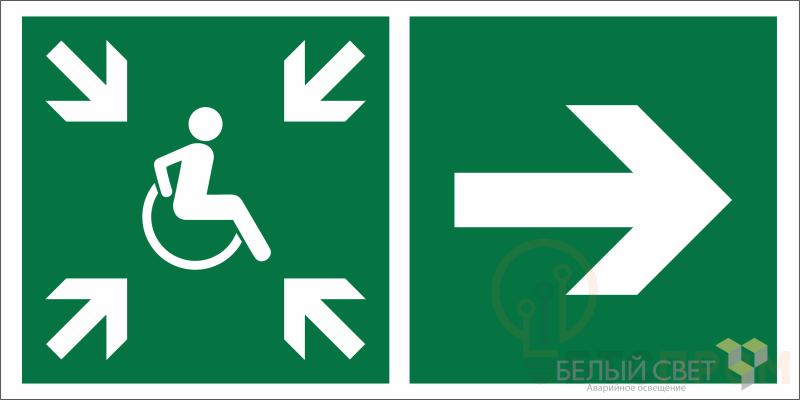 Знак безопасности "Направление движения к пункту сбора (безопасной зоне) МГН направо" габаритные размеры 350х175 мм, фактические размеры 350х175 мм, сигнальный цвет - зеленый, контрастный цвет - белый