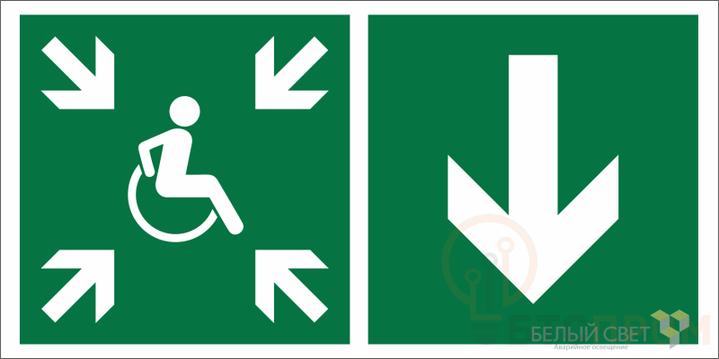 Знак безопасности "Указатель двери пункта сбора (безопасной зоны) МГН (правосторонний)" габаритные размеры 350х175 мм, фактические размеры 350х175 мм, сигнальный цвет - зеленый, контрастный цвет - белый