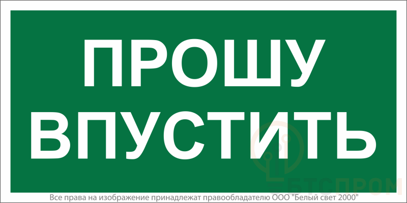 Знак безопасности "Прошу впустить" габаритные размеры 350х175 мм, фактические размеры 350х175 мм, сигнальный цвет - зеленый, контрастный цвет - белый