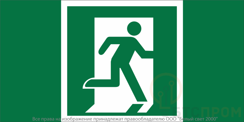 Знак безопасности "Выход здесь (правосторонний)" габаритные размеры 400х200 мм, фактические размеры 200х200 мм, сигнальный цвет - зеленый, контрастный цвет - белый