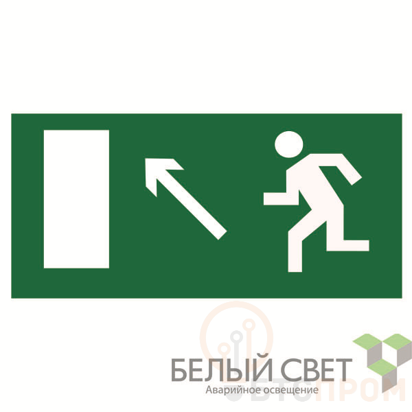 Знак безопасности "Направление к эвакуационному выходу налево вверх" габаритные размеры 400х200 мм, фактические размеры 400х200 мм, сигнальный цвет - зеленый, контрастный цвет - белый