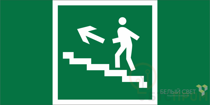Знак безопасности "Направление к эвакуационному выходу по лестнице вверх" габаритные размеры 400х200 мм, фактические размеры 200х200 мм, сигнальный цвет - зеленый, контрастный цвет - белый