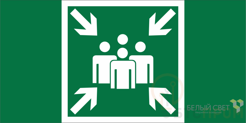 Знак безопасности "Пункт (место) сбора" габаритные размеры 400х200 мм, фактические размеры 200х200 мм, сигнальный цвет - зеленый, контрастный цвет - белый