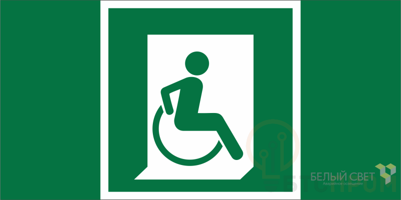 Знак безопасности "Выход для МГН здесь (правосторонний)" габаритные размеры 400х200 мм, фактические размеры 200х200 мм, сигнальный цвет - зеленый, контрастный цвет - белый