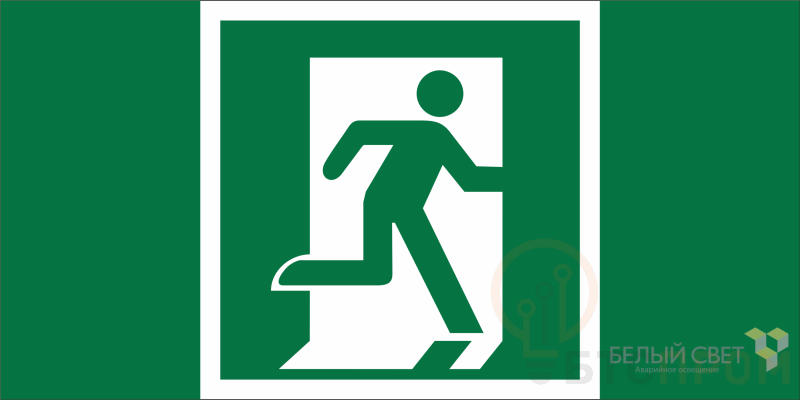 Знак безопасности "Выход здесь (правосторонний)" габаритные размеры 160х80 мм, фактические размеры 80х80 мм, сигнальный цвет - зеленый, контрастный цвет - белый