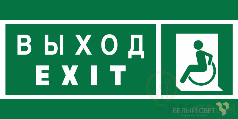Знак безопасности "Указатель выхода для инвалидов в креслах колясках (левосторонний)" габаритные размеры 160х80 мм, фактические размеры 160х59 мм, сигнальный цвет - зеленый, контрастный цвет - белый
