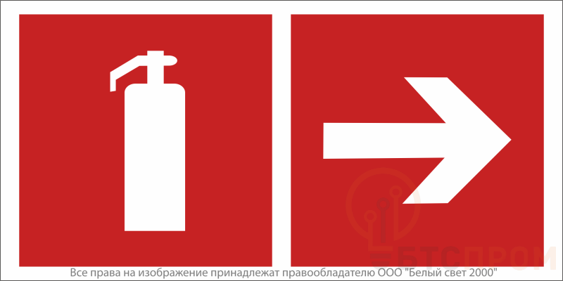 Знак безопасности "Указатель движения к огнетушителю направо", габаритные размеры 200х100 мм, фактические размеры 200х100 мм, сигнальный цвет - красный, контрастный цвет - белый
