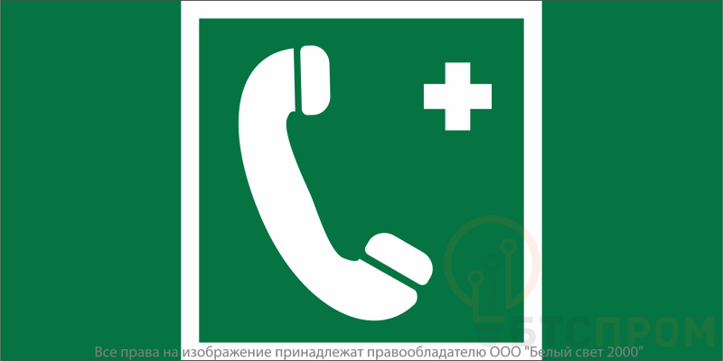 Знак безопасности "Телефон связи с медицинским пунктом (скорой медицинской помощью)" габаритные размеры 270х135 мм, фактические размеры 135х135 мм, сигнальный цвет - зеленый, контрастный цвет - белый