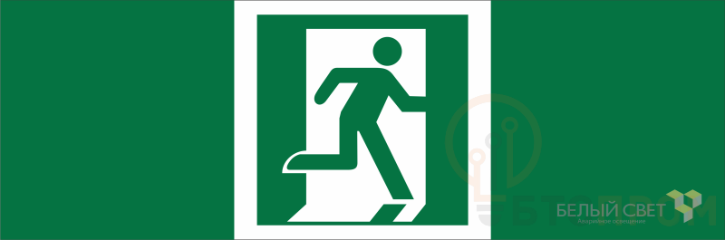 Знак безопасности "Выход здесь (правосторонний)" габаритные размеры 340х125 мм, фактические размеры 125х125 мм, сигнальный цвет - зеленый, контрастный цвет - белый
