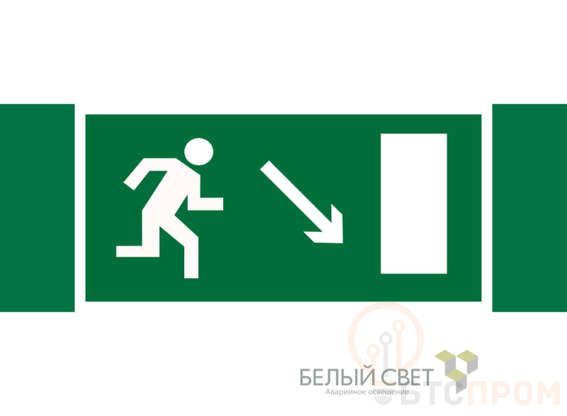 Знак безопасности "Направление к эвакуационному выходу направо вниз" габаритные размеры 340х125 мм, фактические размеры 250х125 мм, сигнальный цвет - зеленый, контрастный цвет - белый