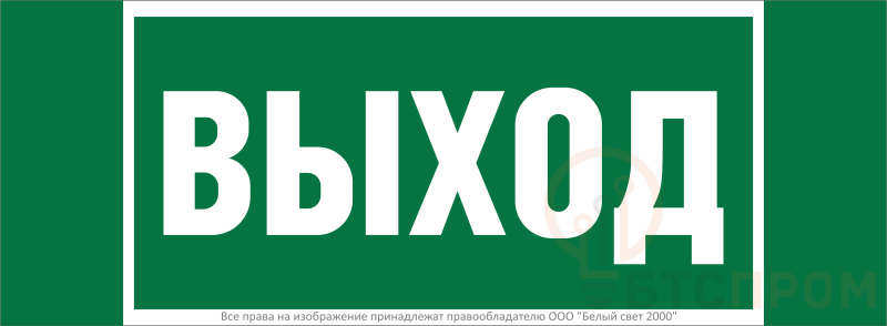 Знак безопасности "Выход" габаритные размеры 340х125 мм, фактические размеры 250х125 мм, сигнальный цвет - зеленый, контрастный цвет - белый