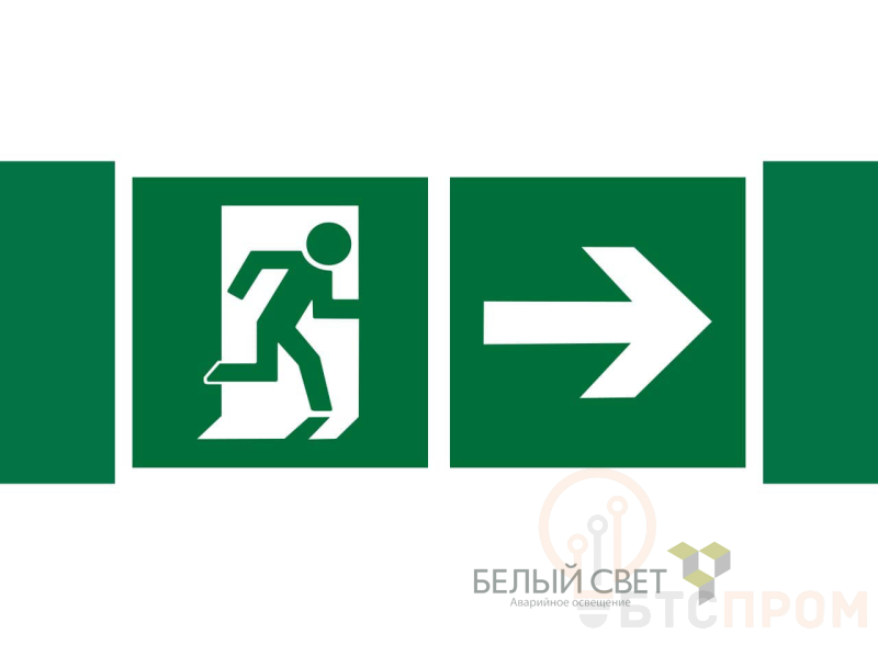 Знак безопасности "Направление к эвакуационному выходу направо" габаритные размеры 340х125 мм, фактические размеры 250х125 мм, сигнальный цвет - зеленый, контрастный цвет - белый