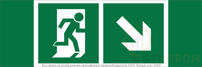 Знак безопасности "Направление к эвакуационному выходу направо вниз" габаритные размеры 340х125 мм, фактические размеры 250х125 мм, сигнальный цвет - зеленый, контрастный цвет - белый