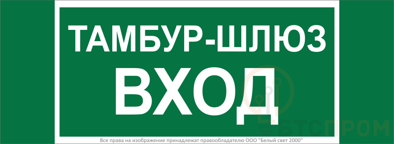 Знак безопасности "Тамбур-шлюз-выход" габаритные размеры 340х125 мм, фактические размеры 250х125 мм, сигнальный цвет - зеленый, контрастный цвет - белый