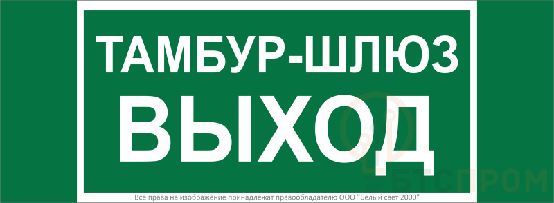 Знак безопасности "Тамбур-шлюз-выход" габаритные размеры 340х125 мм, фактические размеры 250х125 мм, сигнальный цвет - зеленый, контрастный цвет - белый