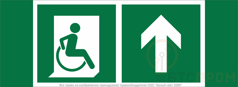 Знак безопасности "Направление движения к эвакуационному выходу МГН прямо" габаритные размеры 340х125 мм, фактические размеры 250х125 мм, сигнальный цвет - зеленый, контрастный цвет - белый