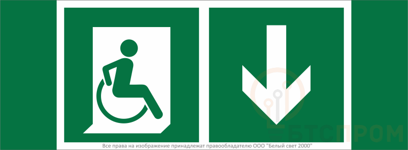 Знак безопасности "Указатель двери эвакуационного выхода (правосторонний) для МГН" габаритные размеры 340х125 мм, фактические размеры 250х125 мм, сигнальный цвет - зеленый, контрастный цвет - белый