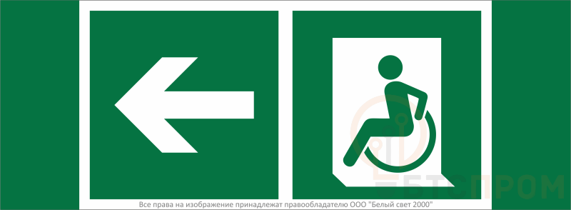Знак безопасности "Направление движения к эвакуационному выходу МГН налево" габаритные размеры 340х125 мм, фактические размеры 250х125 мм, сигнальный цвет - зеленый, контрастный цвет - белый