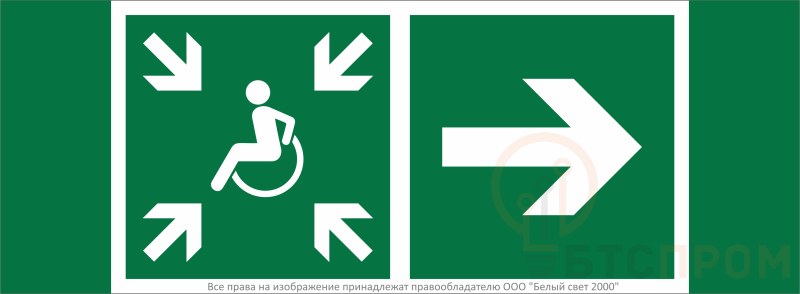 Знак безопасности "Направление движения к пункту сбора (безопасной зоне) МГН направо" габаритные размеры 340х125 мм, фактические размеры 250х125 мм, сигнальный цвет - зеленый, контрастный цвет - белый