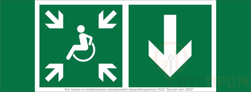 Знак безопасности "Указатель двери пункта сбора (безопасной зоны) МГН (правосторонний)" габаритные размеры 340х125 мм, фактические размеры 250х125 мм, сигнальный цвет - зеленый, контрастный цвет - белый
